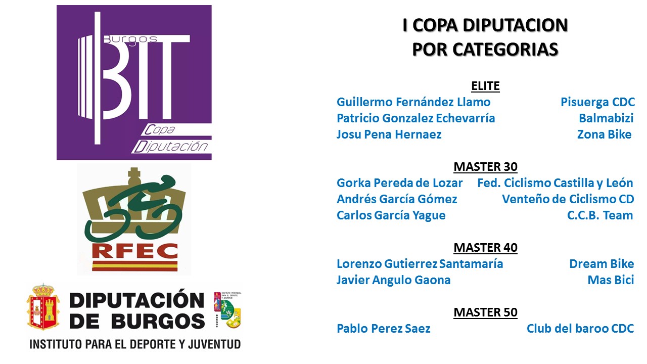 Coincidiendo con el final del Circuito Provincial BTT de Burgos, ya ha llegado el final de la espera para el reconocimento de los premiados, en esta 1ª COPA DIPUTACION DE BURGOS. La entrega tendrá lugar en el Real Monasterio de San Agustín, ( calle Madrid), el día 27 de noviembre a las 20.00 horas. Se premiará a los tres primeros de cada categoría, así como al ganador absoluto de la categoría masculina y femenina, que hayan participado en al menos 4 de las 5 marchas de las que constaba la competición en esta 1ª edición, según reglamento.